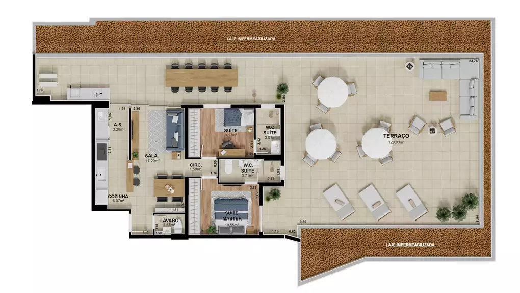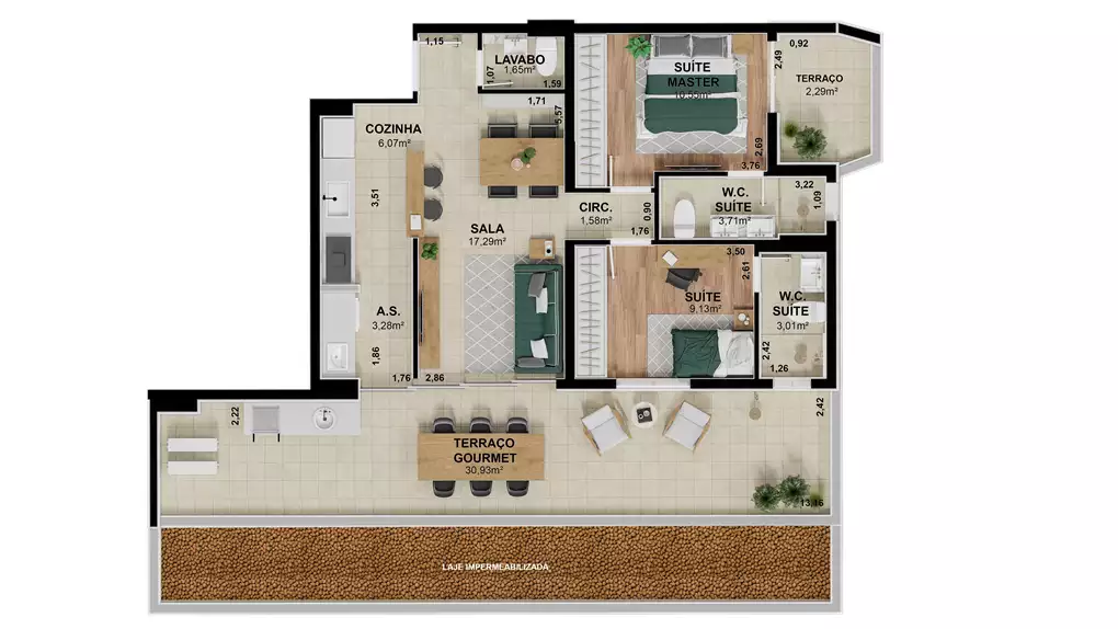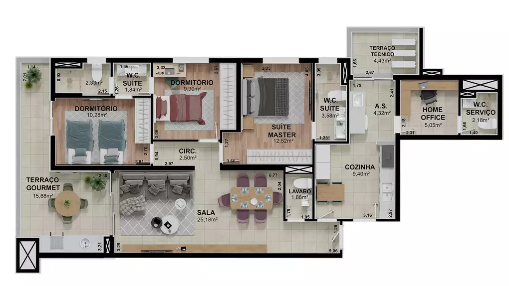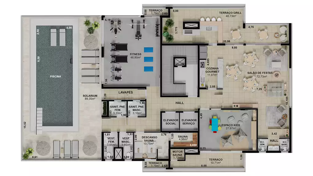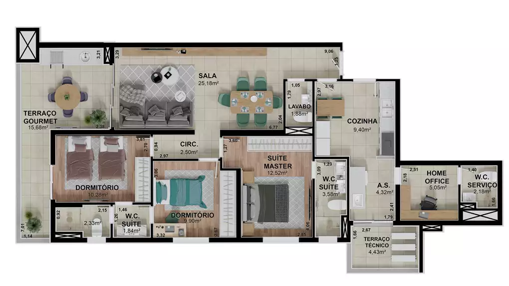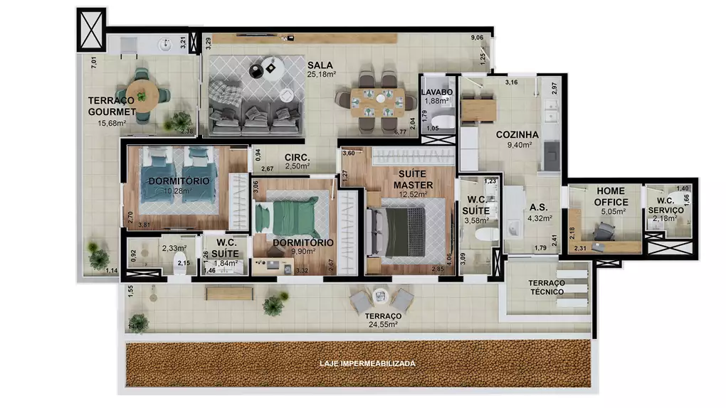 Revestimentos de porcelanato em todos os ambientes com rodapé (exceto nos dormitórios);