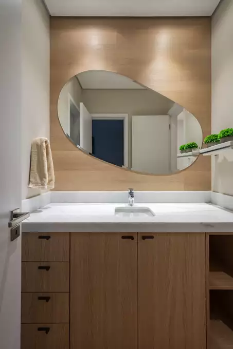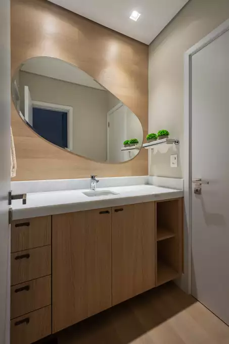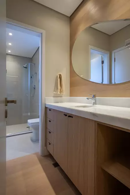Pias de cozinha em granito e de banheiros em mármore (todas com saia no mesmo material).